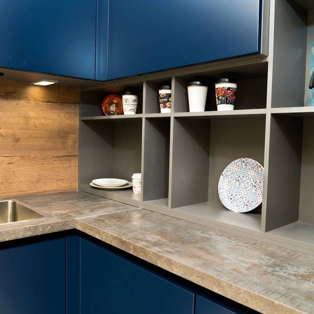 Глубокий синий, тёплое дерево, открытые ячейки — стильная, удобная и просто классная.