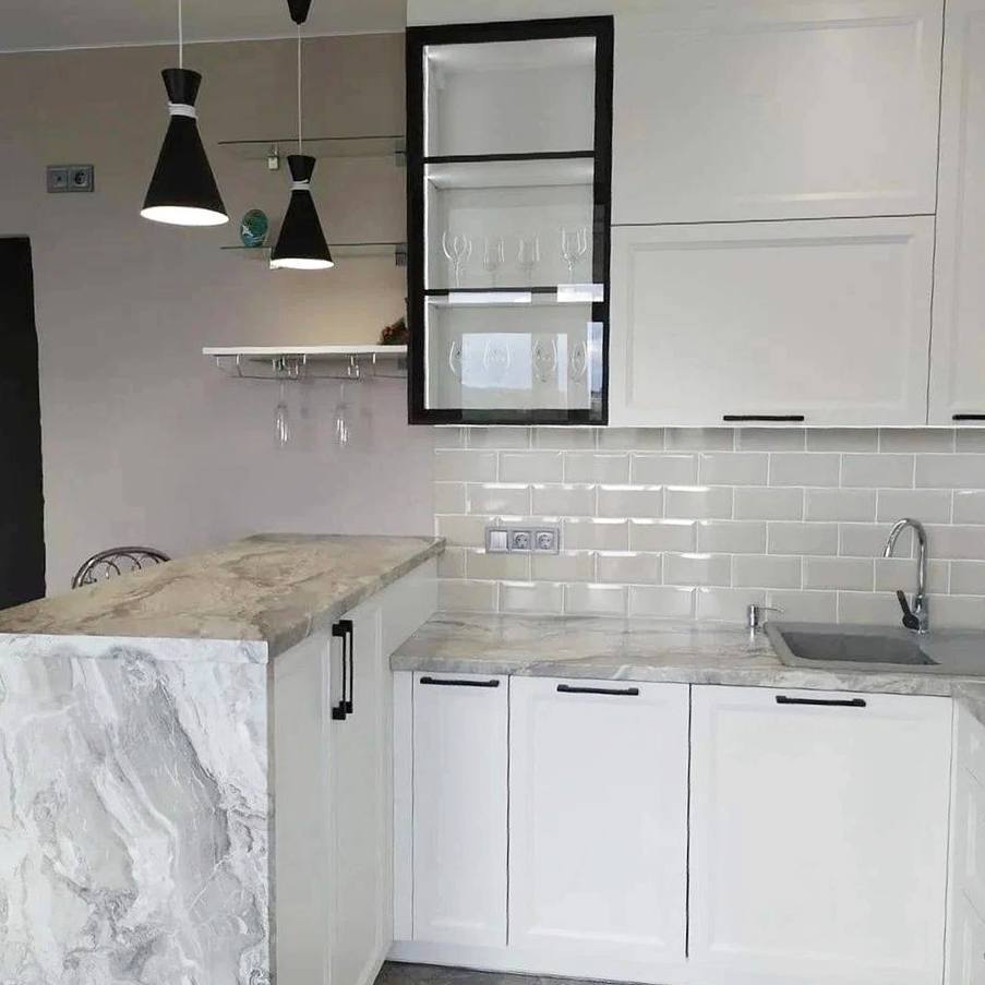 И витрина с чёрным профилем — изюминка этого гарнитура, с которой кухня выглядит ещё интереснее.