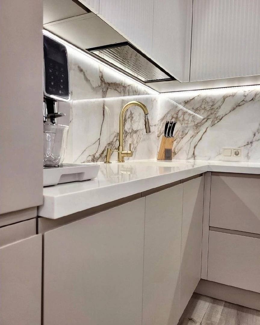 Фасады без ручек, встроенная техника, аккуратная подсветка в рабочей зоне — всё смотрится легко и современно, а пользоваться таким гарнитуром