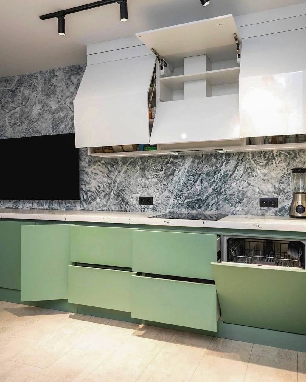 💚Выбрали фасады AGT в мягком зелёном оттенке и добавили белый глянец — получилось свежо, легко и со вкусом. Такая гамма будто добавляет воздуха и хорошего настроения.